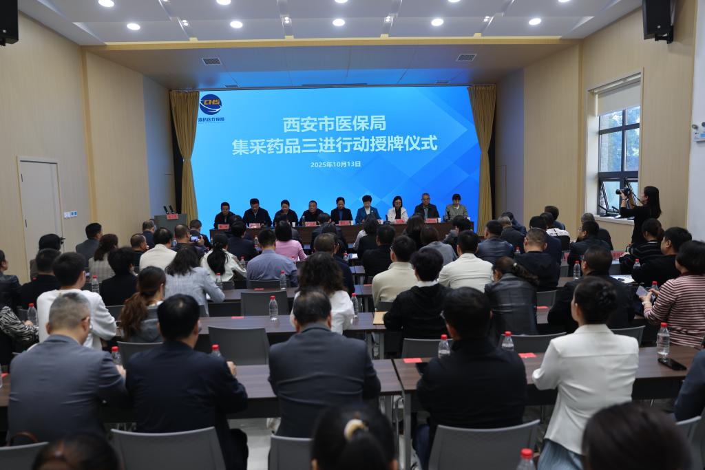 2025年10月13日下午,西安市医保局举行集采药品三进行动授牌仪式,我院被授予集采药品医保惠民示范点四星级单位,王保山院长出席仪式并上台接牌。