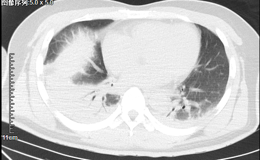 完善的CT检查显示:双肺渗出性改变伴部分实变,立即联系呼吸与危重症医学科王婷婷副主任为患者床旁行支气管镜检查,发现双肺下叶支气管被脓痰不完全阻塞,给予灌洗及对症处理。