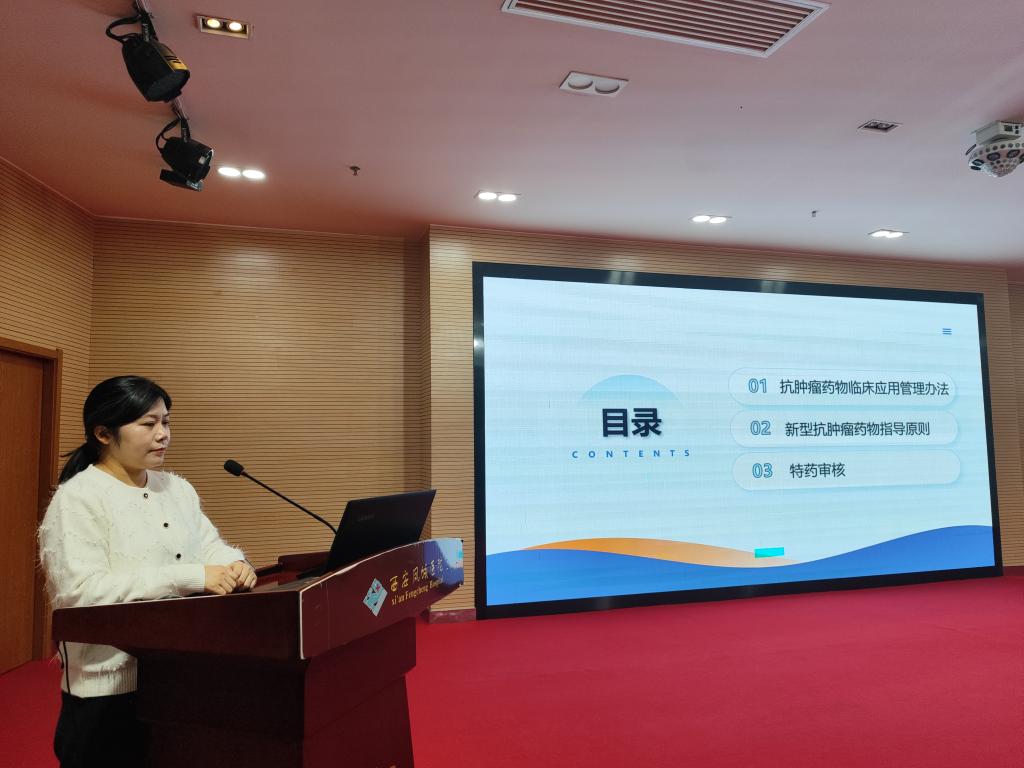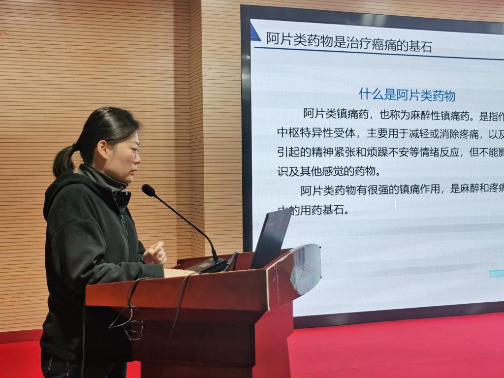 培训会上,临床药师根据工作实际情况,分别围绕《抗菌药物临床合理使用》、《阿片类药物特点及不良反应防治》、《抗肿瘤药物临床应用规范化培训》进行分享。