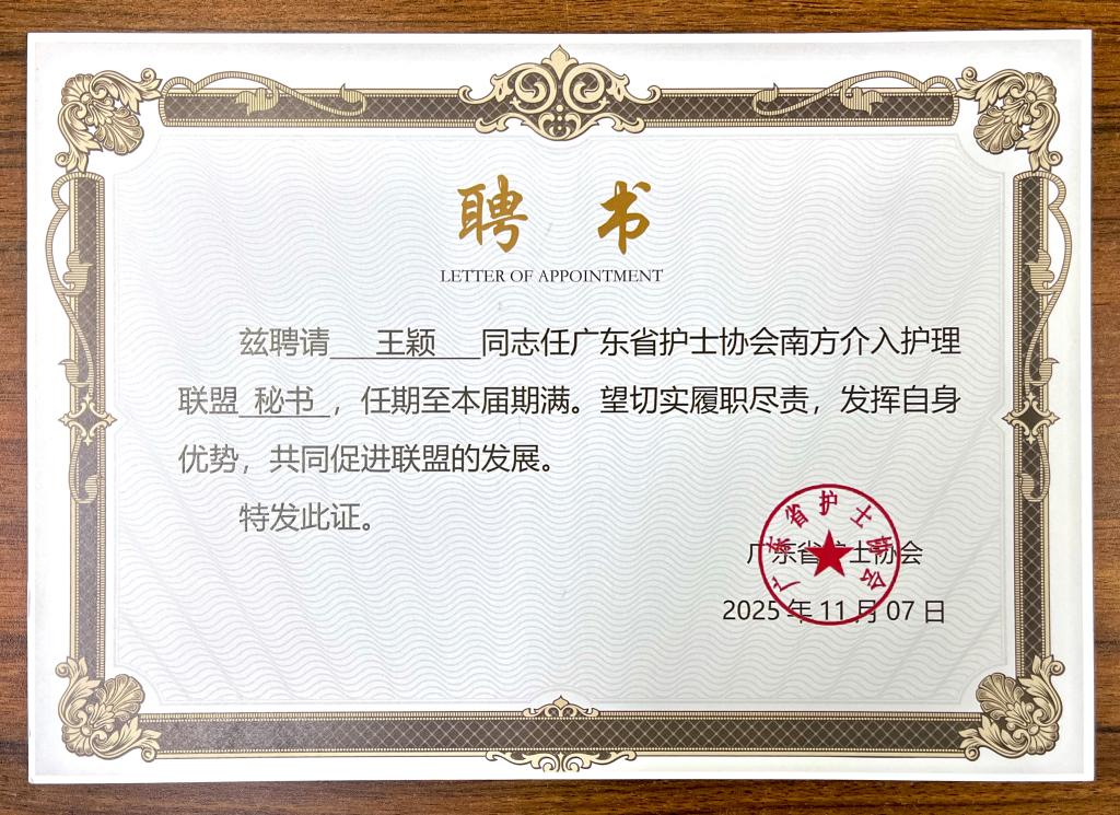 同时,我院介入手术室护士长凭借扎实的专业功底、丰富的临床经验及行业影响力 ,当选为广东省护士协会南方介入护理联盟秘书。这既是对王颖护士长个人专业能力的认可,也为我院搭建了与国内顶尖医疗机构介入护理领域交流合作的桥梁。