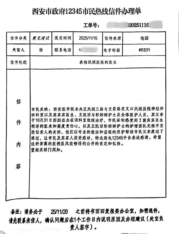 近日,西安凤城医院神经外科收到了一份来自患者家属的特殊“礼物”——一通情真意切的12345市民热线表扬电话和一面满载谢意的锦旗。这不仅是对裴宾宾医生、王凯丽护士、郭娜娜护士及科室全体医护人员精湛医术与暖心服务的充分肯定,更是对“敬佑生命、救死扶伤、甘于奉献、大爱无疆”崇高职业精神的最佳诠释。