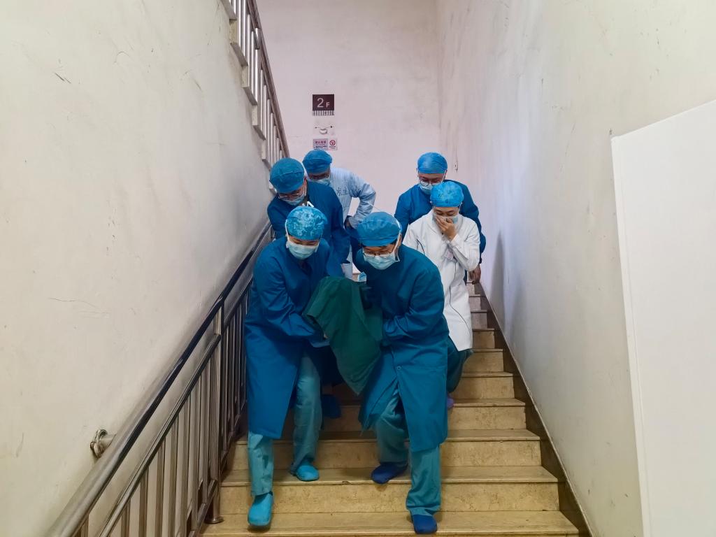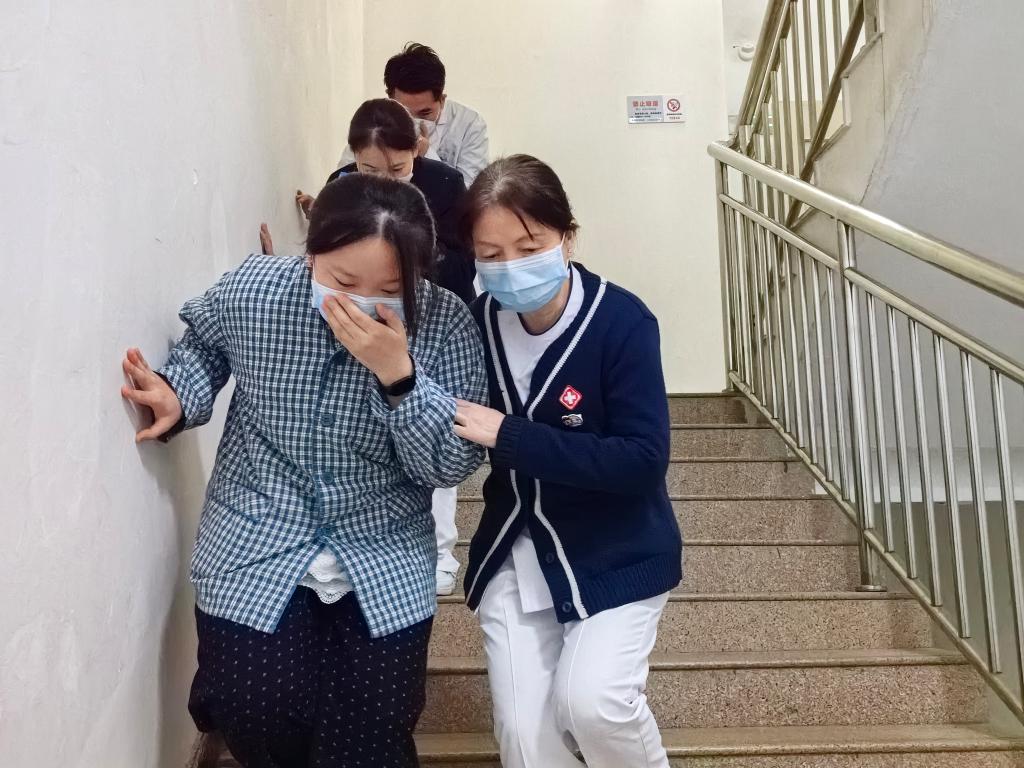 现场指挥李建荣(院党总支书记)沉着冷静地下达着一道道清晰的指令,各小组按预案分工,协同展开应急处置。疏散过程中,医护人员或搀扶、或抬着担架,引导“病患”用湿毛巾捂住口鼻,弯腰低姿,快速通过浓烟区域,秩序井然。