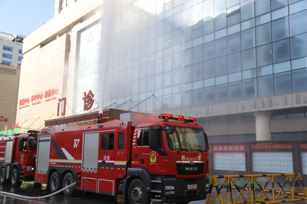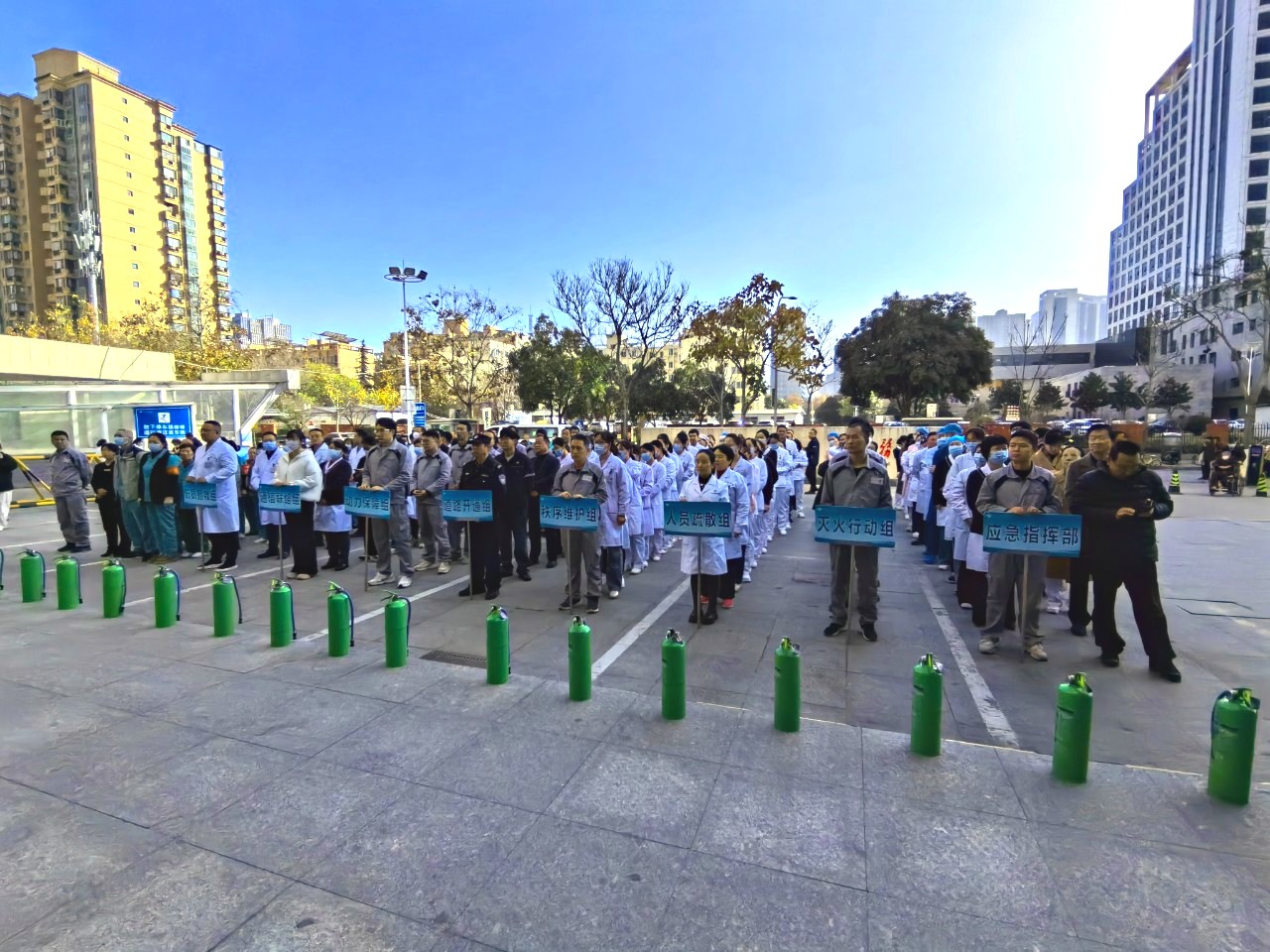 与此同时,门诊大楼前,一场与时间赛跑的集结正在上演。通讯联络组、灭火行动组、人员疏散组、秩序维护组、伤员抢救组、道路开通组、动力保障组……各小组负责人清点人员、设备、器械、药品后,携带专业装备,火速奔赴指定区域列队待命。空气中弥漫着紧迫的氛围,每一位成员的眼神都透露出坚定的责任感——守护医患安全,不容有失!
