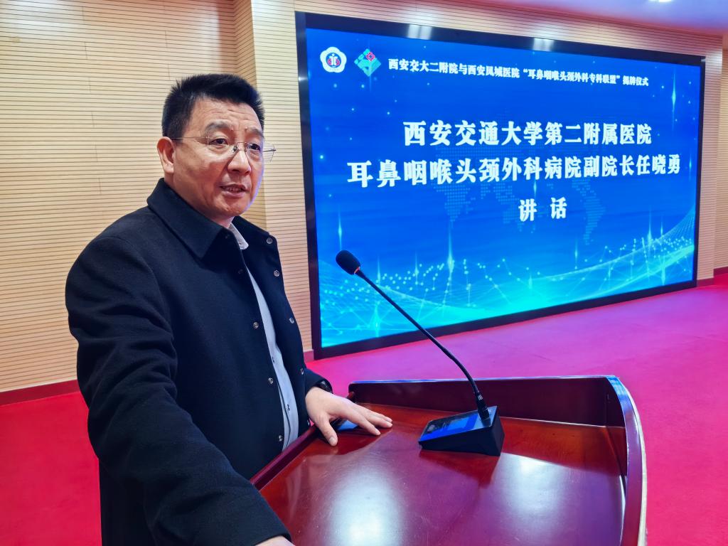 随后,西安交大二附院耳鼻咽喉头颈外科主任任晓勇发表讲话。他指出,专科联盟建设是国家推动医疗资源下沉、促进分级诊疗体系完善的重要部署。西安交大二附院耳鼻咽喉头颈外科将以此次合作为契机,充分发挥学科优势,与西安凤城医院构建全方位、深层次的合作体系。除了专家坐诊、疑难病例会诊、技术指导、学术交流、人才培养等常规合作形式外,同时推进双向转诊机制的落地见效,实现“大病不出省、康复在基层”的分级诊疗目标。通过双向转诊的闭环管理,既能让患者获得精准高效的治疗,减少就医奔波和成本,又能实现医疗资源的优化配置,推动区域内耳鼻咽喉头颈外科诊疗标准的统一和医疗服务质量的整体提升,让群众在家门口就能享受到三甲医院的优质医疗资源。