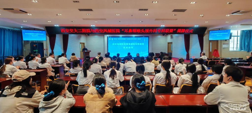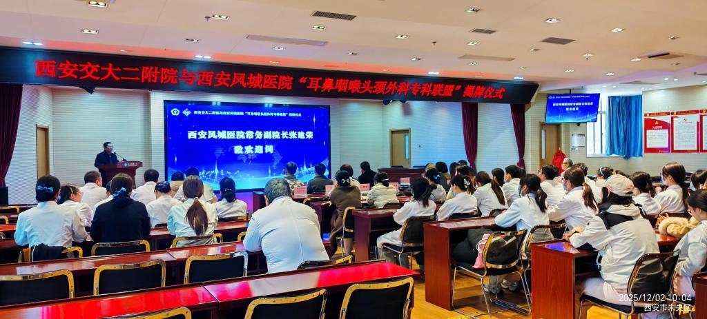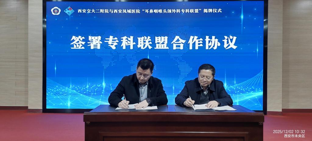 12月2日上午10点,西安交大二附院与西安凤城医院“耳鼻咽喉头颈外科专科联盟”授牌仪式在西安凤城医院综合行政办公楼5楼会议室隆重举行。此次联盟的成立,标志着两家医院在耳鼻咽喉头颈外科领域的深度合作正式启动,将为区域内耳鼻喉疾病患者带来更优质、高效、便捷的医疗服务。