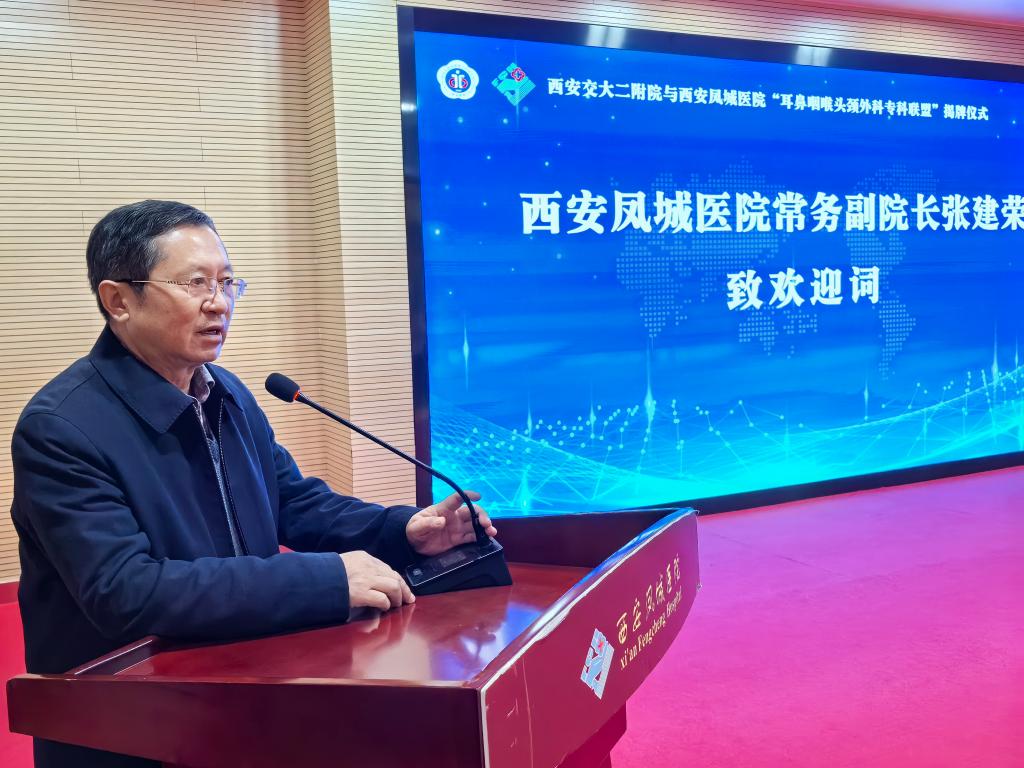 仪式伊始,我院常务副院长张建荣发表欢迎致辞。他对西安交大二附院专家团队的到来表示热烈欢迎,对专科联盟的成立致以诚挚祝贺。张建荣副院长表示,西安交大二附院耳鼻咽喉头颈外科在医疗技术、人才培养、科研创新等方面拥有深厚积淀;西安凤城医院深耕区域医疗服务多年,在耳鼻喉疾病诊疗方面积累了丰富的临床经验和广泛的患者基础。此次联盟的建立,是双方优势互补、资源共享的重要举措,将为我院耳鼻咽喉头颈外科的学科建设、技术提升、人才培养注入强大动力,助力医院进一步提升诊疗水平和服务能力,更好地满足周边群众的健康需求。