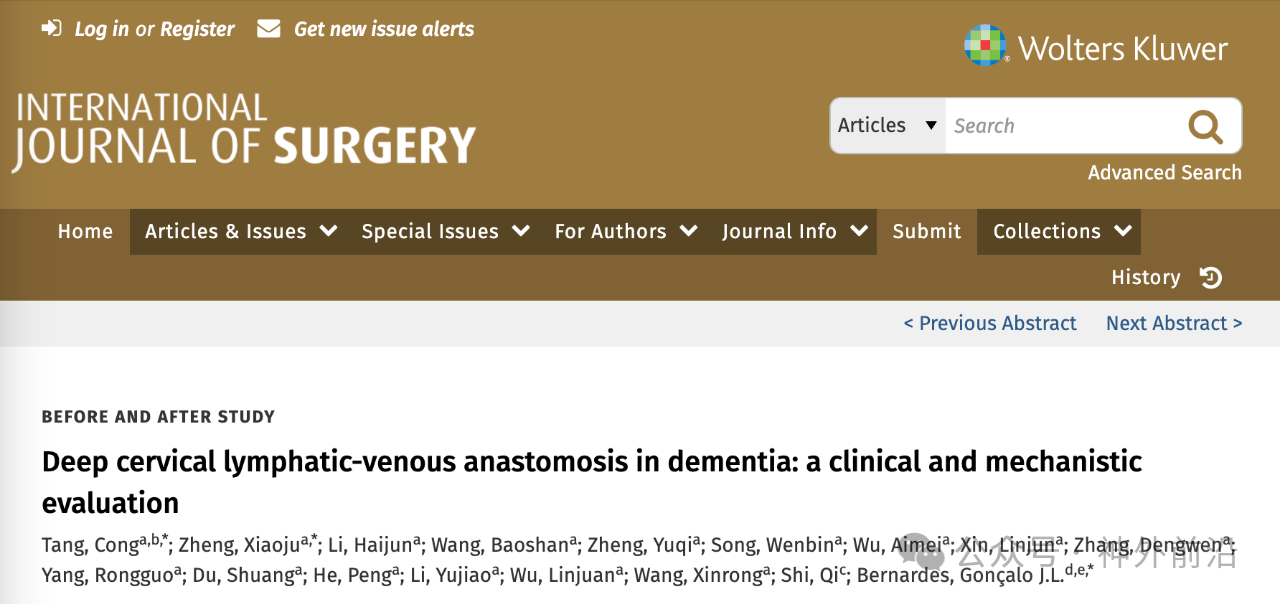 近日,我院显微外科团队在国际外科学领域权威期刊《International Journal of Surgery》(中科院2区,JCR Q1,影响因子10.3)在线发表了题为《Deep cervical lymphatic-venous anastomosis in dementia: a clinical and mechanistic evaluation》的探索性研究成果。该研究由西安凤城医院联合葡萄牙Gulbenkian分子医学研究所、英国剑桥大学及西班牙国家癌症研究中心等多家国际知名科研机构共同完成,标志着我院在痴呆外科治疗领域的临床与基础研究走向国际前沿。