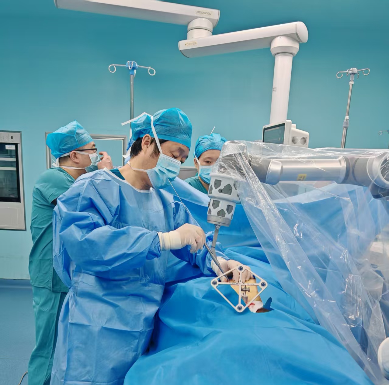 我们的骨科二病区团队没有因为患者高龄而退缩,张宏主任联络麻醉科手术室和胸外科,通过严谨评估,为其“量体裁衣”,实施了精准、微创的“骨科机器人辅助下胸椎椎体成形术”治疗。