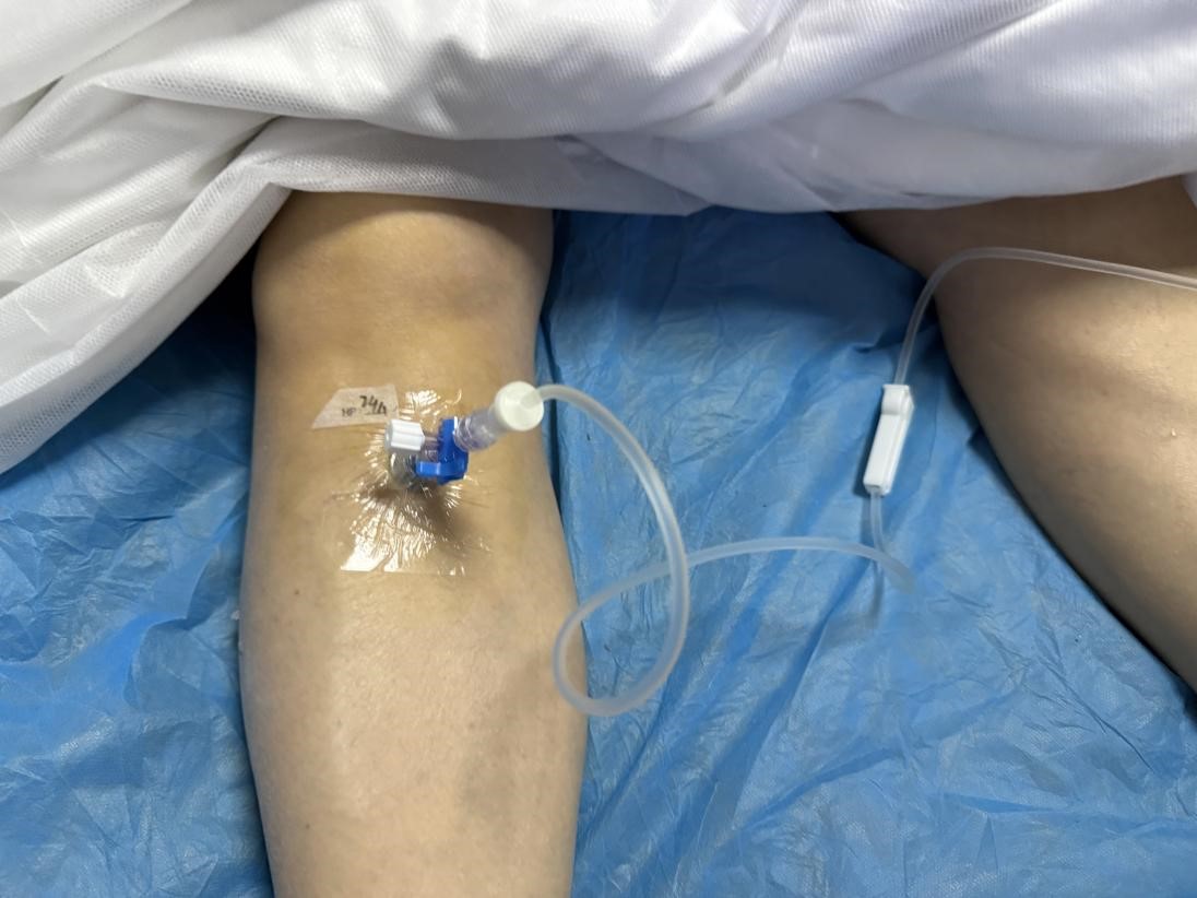 “创伤休克患者的黄金抢救时间仅有数分钟,外周静脉通路无法建立就意味着丧失救治先机。”吴医生回忆道。在这千钧一发之际,团队迅速启动应急预案,决定采用骨髓腔输液这一急救“硬核技术”。医护人员默契配合,吴医生快速定位患者胫骨近端穿刺点,严格执行无菌操作,手持专用穿刺针精准穿透骨皮质。当确认穿刺针成功进入骨髓腔,清亮的骨髓液回抽而出的瞬间,现场医护人员立刻连接加压输液装置,抢救药物与晶体液顺着这条特殊通路快速输注,在大家共同努力下患者于8:36分心跳恢复113次/分,随之血压测量86/42mmHg,血氧饱和度稳步上升,患者生命体征趋于平稳,为后续明确诊断赢得了宝贵时间。