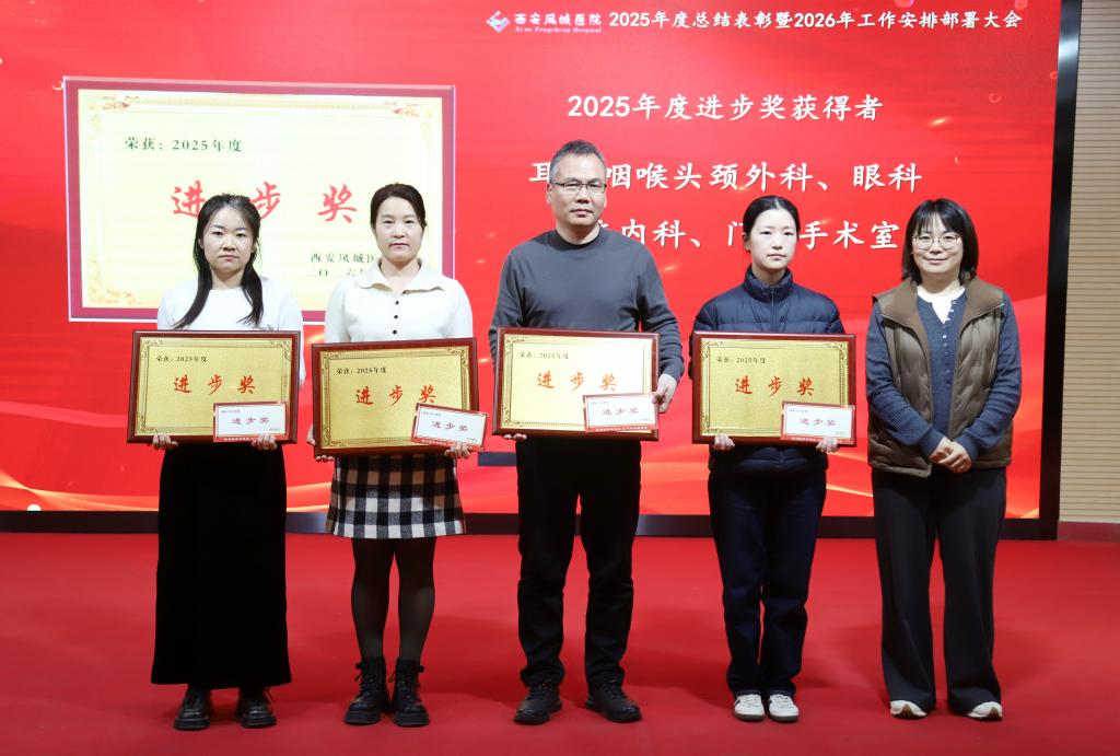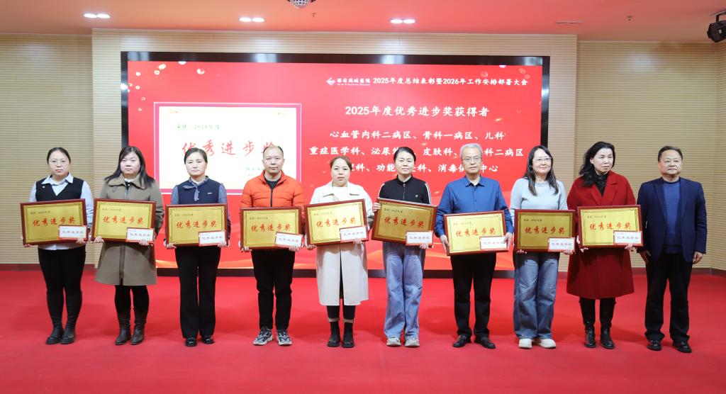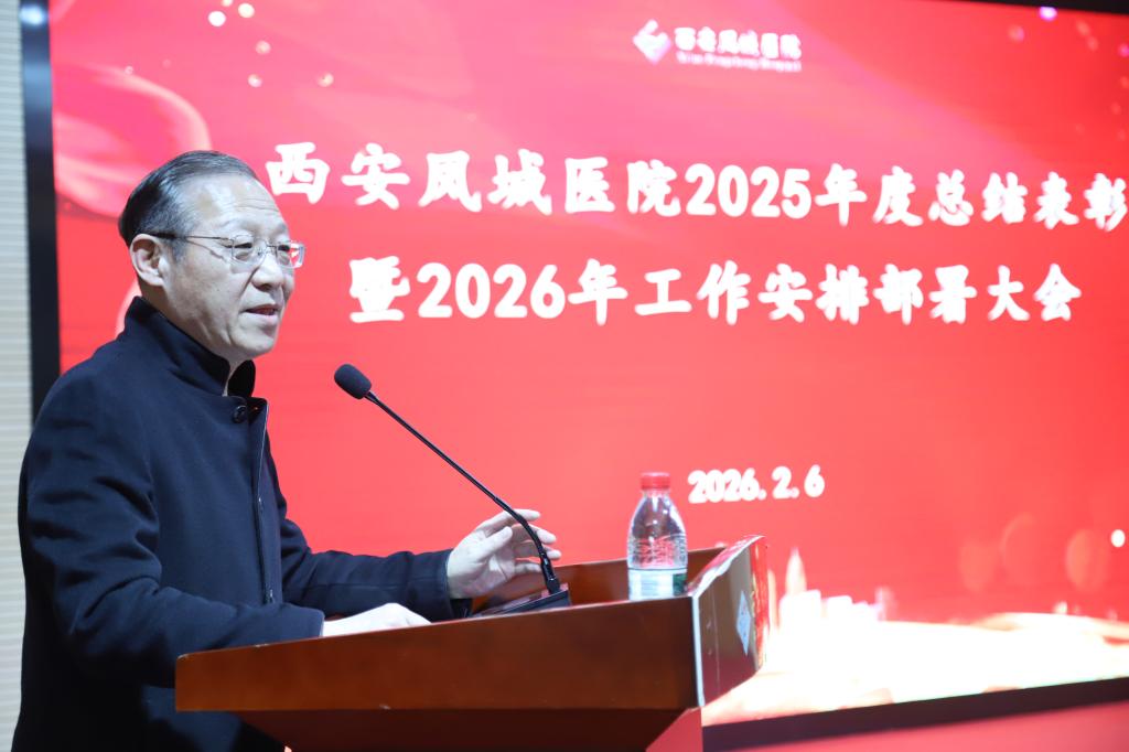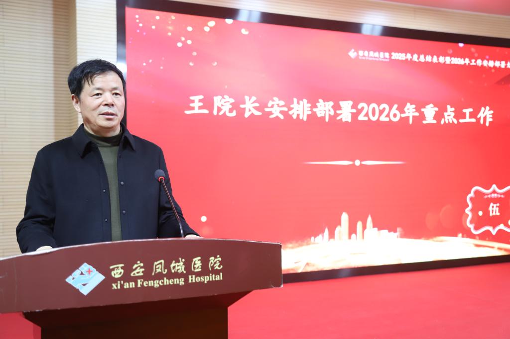 最后,王院长作了重要讲话。他首先向为医院发展做出贡献的全体员工表示衷心的感谢,向在过去一年里取得优异成绩的先进集体和个人表示热烈的祝贺!他对2025年度医院取得的主要成绩进行了简要回顾,对医疗市场新形势进行了分析,重点对2026年医院的主要工作进行了安排部署,强调2026年要把“强特色、深内涵、提质量、增总量”作为医院工作的指导思想,加强科学管理,以学科建设和创新发展为动力,以创建三级甲等医院为抓手,不断提升医院内涵质量,集中抓好五个方面的工作:一是全力以赴推进三甲医院创建工作;二是不断深化医院内涵建设;三是加强学科建设,提升医院核心竞争力;四是高度重视并切实抓好医保工作;五是夯实基础建设和人才队伍建设。号召全院员工在2026年要以年度目标为导向、以实现发展为重点、以医疗质量安全为抓手,集中精力抓落实,为实现年度发展目标任务做出积极努力,不断推动医院高质量可持续发展。
