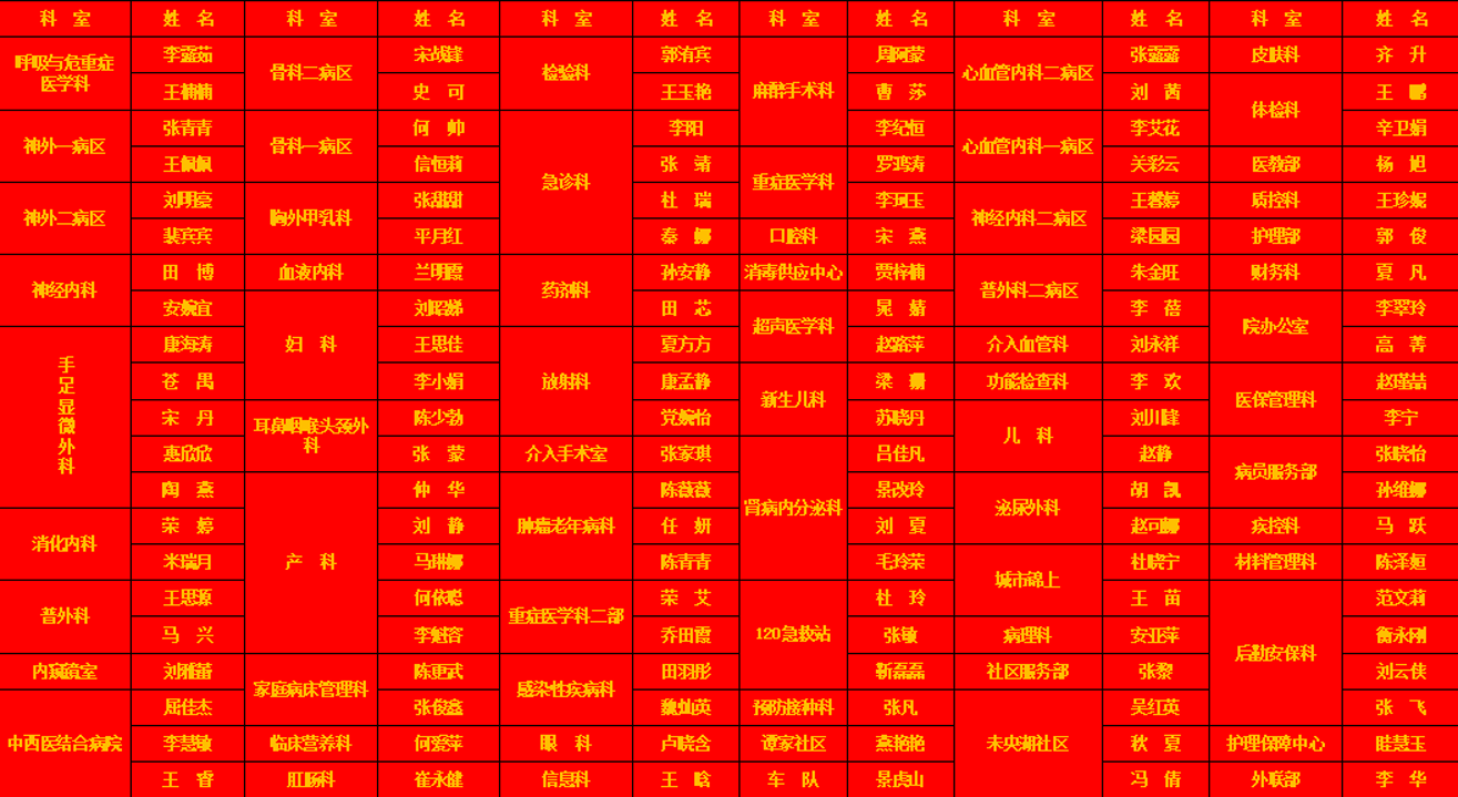 院办公室、医教部、护理部、质控科(含病案室)、医保管理科、病员服务部、材料管理科、后勤安保科、信息科