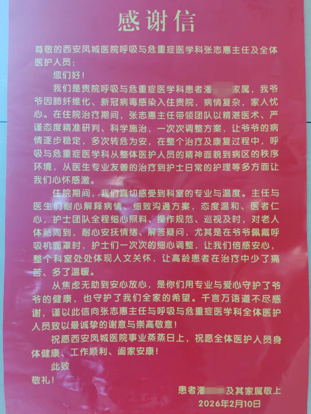 尊敬的西安凤城医院呼吸与危重症医学科张志惠主任及全体医护人员:
