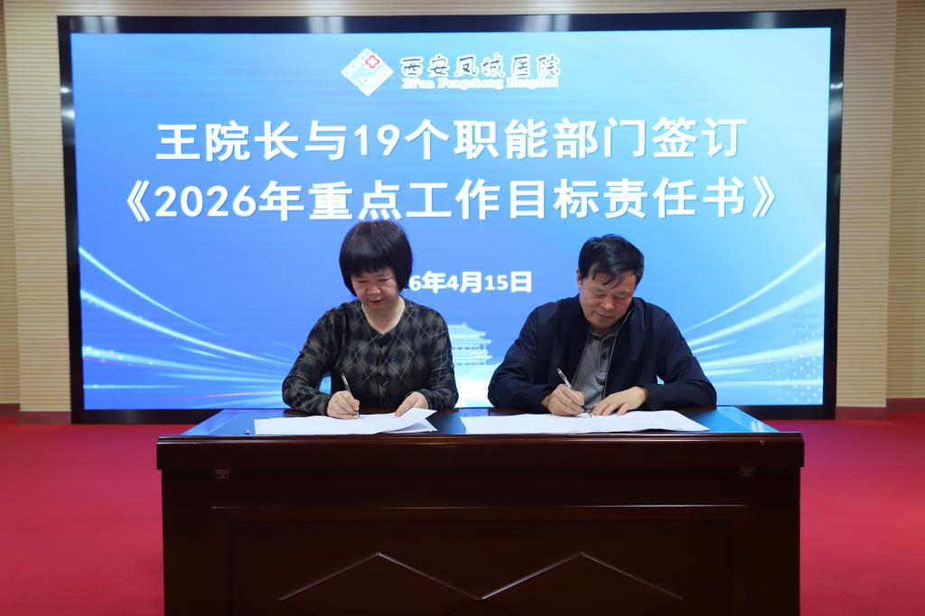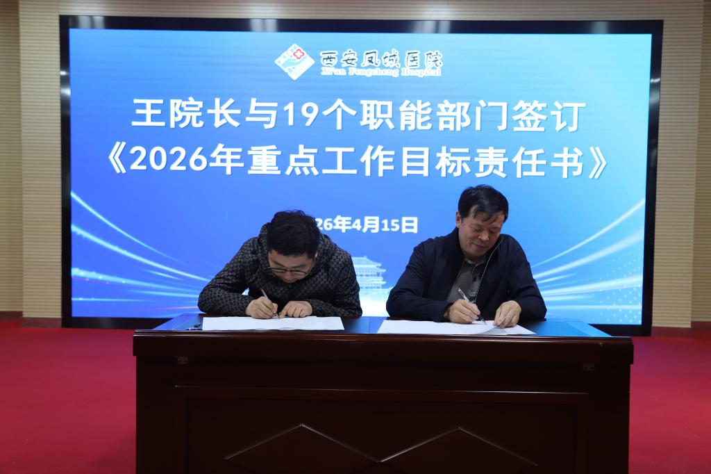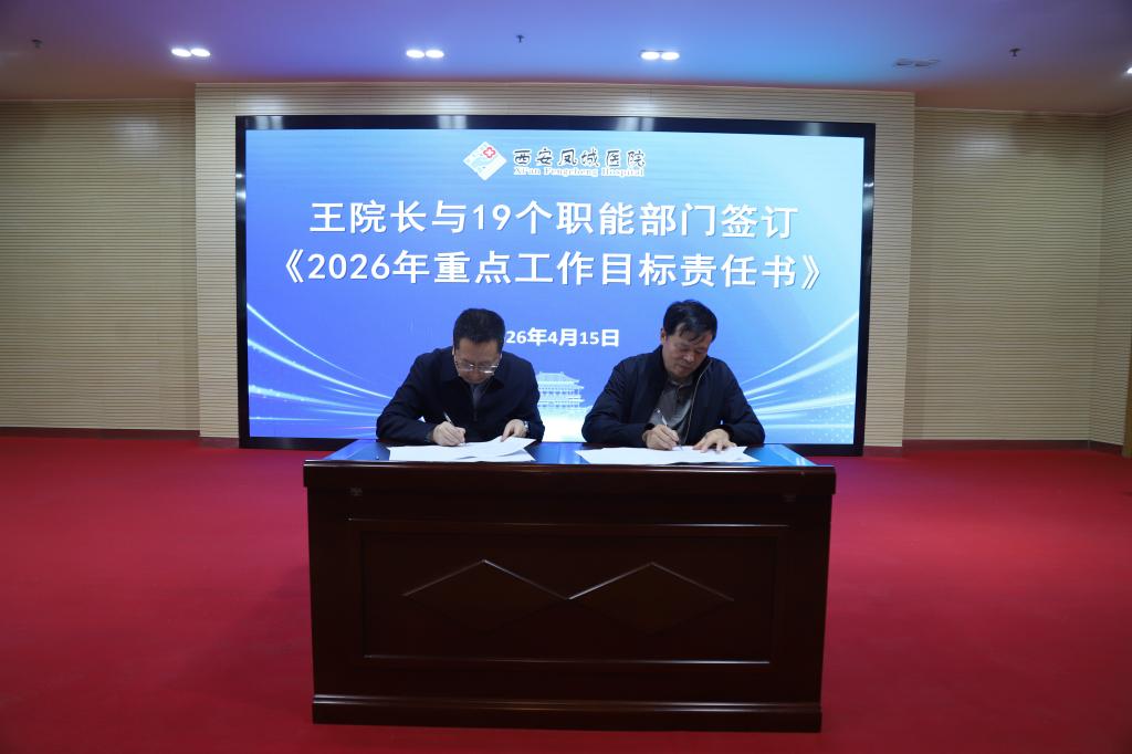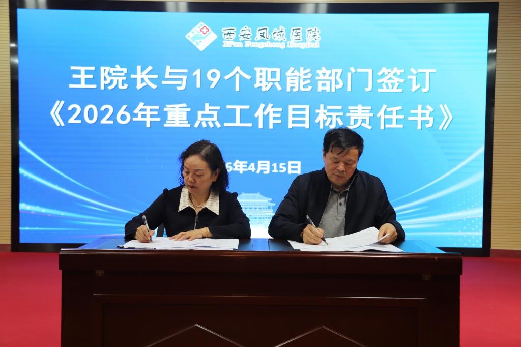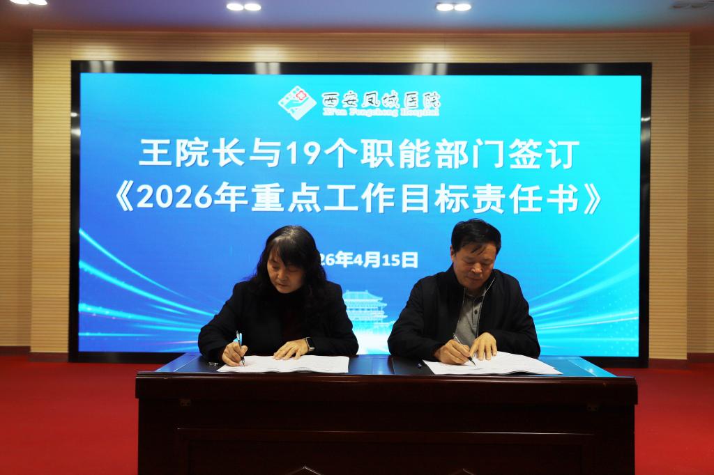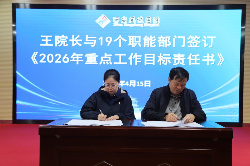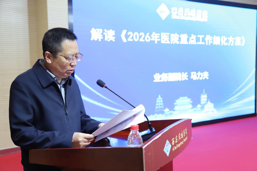 会上,首先由院办公室主任崔瑛通报了2025年度机关目标管理工作情况,她从2025年目标管理开展的基本情况、全年目标任务完成情况、取得的成效与存在的问题三个方面进行了详细的通报。总体来看,2025年机关目标任务完成情况良好,总体完成率达92.92%。马院长对《2026年医院重点工作细化方案》进行了详细的解读。王院长与19个职能部门负责人签订了《2026年重点工作目标责任书》。