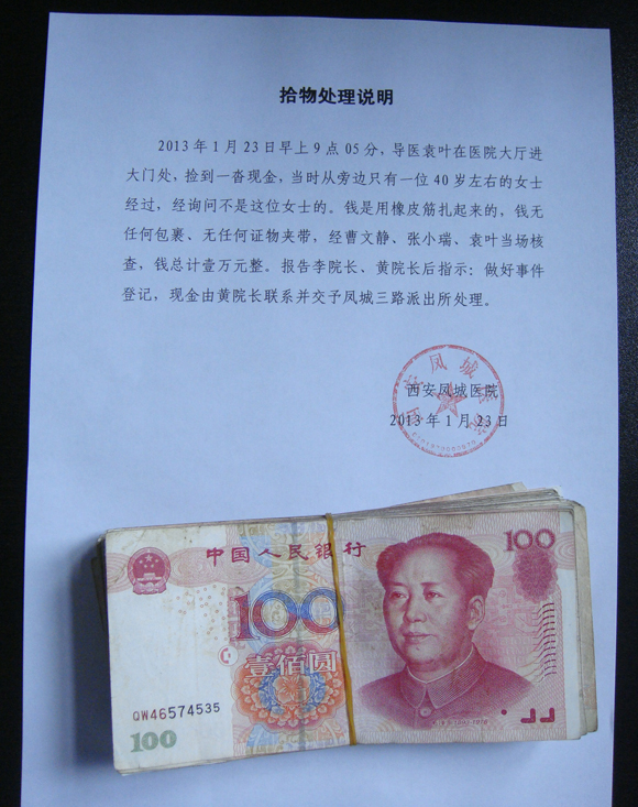 2013年1月24日上午9时05分,西安凤城医院导医袁叶在门诊大厅进门处捡到一沓现金。经与工作人员曹文晶、张晓瑞共同核查:现金用橡皮筋扎捆,无任何包裹、无任何证件与夹带,共计1万元整。因为刚上班不久,大厅当时无病人候诊,无人经过。无法及时找到失主,又想到丢钱人一定很着急,导医袁叶随即将捡到的1万元现金上交医院病员服务部。