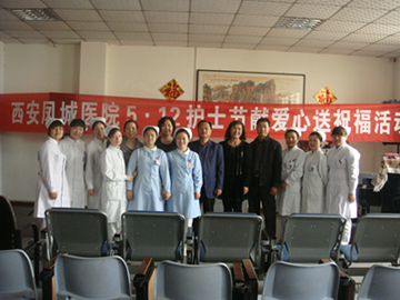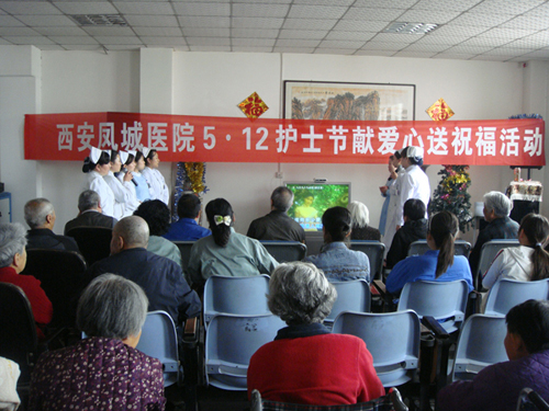 今年5.12护士节的到来也恰好是母亲节,我院护理部为了弘扬南丁格尔精神,深化尊老爱老敬老意识,于2013年5月9日,组织各科护士长们前往泾渭老年公寓举行献爱心送温暖活动。为老人们送去了欢乐的笑声,让他们感觉到社会的温暖和关怀,生活得更加健康快乐。