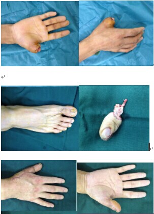 高华(化名),26岁,是一名普通工人,工作中不慎被钢丝绳绞断右拇指,在当地几家医院就诊后均被告知只能截掉。当时他感觉天塌下来了。后经同事介绍,连夜乘坐长途汽车来到凤城医院手外科就诊,高华父亲含泪说:你们一定要保住他的指头呀,他还那麽年轻,还没有成家立业呀……父亲的话让在场的医生感觉责任重大,这个手指对于高华及他的家庭是多么的重要。宋文斌医生查看患者后,及时向郑晓菊主任汇报病情。经过讨论,由于受伤时间已达12小时、损伤太严重。郑主任为其制定了手术方案,一期急诊为患者行拇指清创术。二期在全麻下行游离拇甲瓣移植再造拇指术。经过长达6小时的手术顺利完成,术后全科医护理人员严密认真观察。再造指成活,后期手外科的康复师们为其指导康复锻炼。目前高华的再造拇指外形美观、功能恢复良好。60多岁的父亲出院当日对主任说:感谢你们的再造之恩,让我们的家庭重回欢乐。