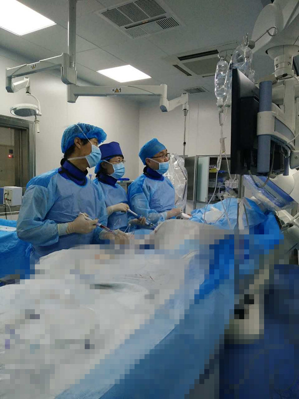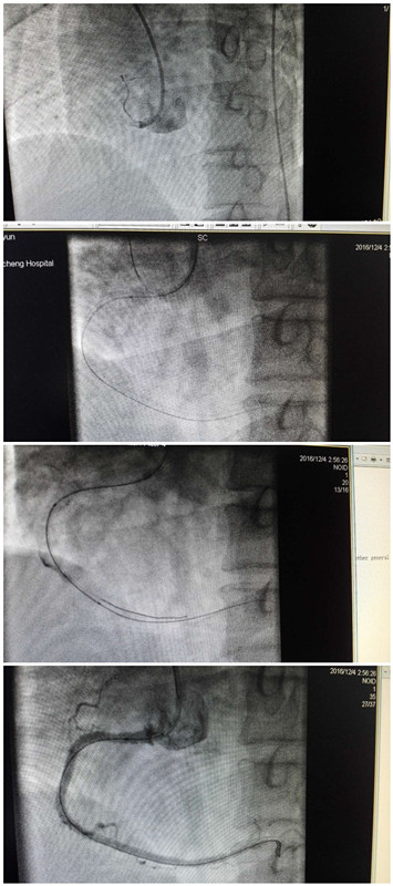 患者为52岁的男性,因持续心前区疼痛6小时就诊于我院急诊科,据心电图特点诊断急性下壁心肌梗死,于12月4日凌晨收住心血管一病区、神经内科。薛虹主任迅速赶到科室,询问病情检查患者后,意识到必须尽快行冠脉介入治疗开通闭塞血管,挽救心肌,使患者得到最大的获益。与家属多次沟通,家属经过紧张的心理调节后,同意手术开通血管。向总值班闫副院长、蔡护士长汇报后,得到了大力支持。紧张术前准备的同时,通知介入室做好手术准备,科室李金科主治医师第一时间从咸阳赶到,介入室人员、麻醉师、省人民医院心内科梁磊副主任迅速到位,一切准备就绪,于凌晨2点55分开始手术,术中发现右冠开口齐头闭塞并有夹层,前降支中段60%狭窄,远端闭塞,第一对角支90%狭窄,眼前的情景让术者震惊了,比预想的要严重得多,术中随时可能室颤,心脏骤停,医生要冒极大的风险,如不开通血管,则死亡一步步逼近。手术面临着艰难的选择,生死关头,责任和担当是相等的沉重,需要果断决策,医者仁心,为救患者,甘当风险,一场没有硝烟的战斗开始了,手术中的每一步都是难点,需要耐心细致、精确地操作,通过艰难的跋涉,最终开通了右冠脉,植入了3枚支架,再次造影显示血管开通血流TIMI3级,手术取得了圆满成功,时间已是凌晨5点多了。大家都如释重负,脸上露出了胜利的喜悦,沉重的铅衣及2个多小时紧张的手术使大家筋疲力尽,汗流浃背。