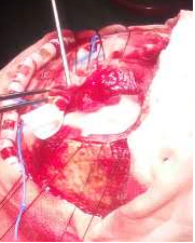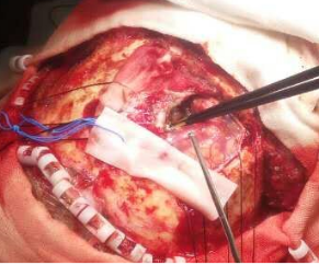 月11日上午9点30分,我院神经外科王冰主任亲自主刀,带领神经外科专业医疗团队,在麻醉科医师的协助下,为郭大爷行“额部肿瘤切除术+颅骨修补术”。术中发现病变组织竟然已侵蚀颅骨(图2),向头皮外生长,与脑组织及硬脑膜紧密粘连,侵犯矢状窦,手术过程中稍不留意就会出现大出血,风险极大。王冰主任凭借自己多年的临床经验及手术经验,临危不惧。经过近3个小时的不懈努力,终于完整清除郭大爷被肿瘤侵犯的脑组织、脑膜及颅骨(图3)。手术非常顺利。术后郭大爷神志清楚,恢复良好。现已转出神经外科监护室,到普通病区继续康复治疗。