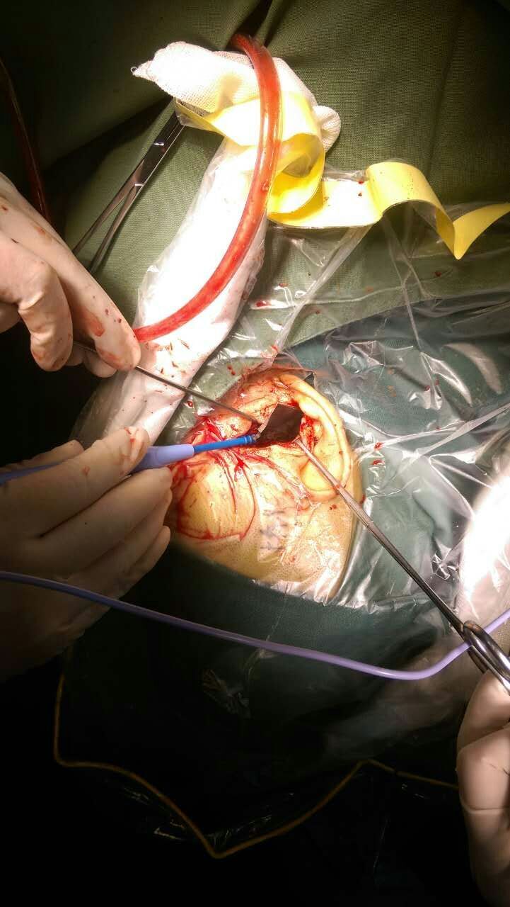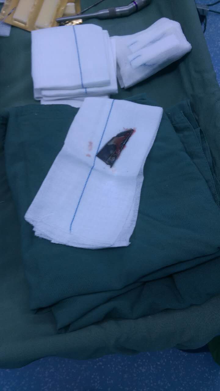 危急关头,神经外科、急诊科相互配合,迅速做好术前准备,以最快的速度将夫妻二人送入手术室。王冰主任带领专业团队,在麻醉科的配合下先后对夫妇二人进行了“开放性颅脑损伤清创术、异物取出术、颅骨整复术、耳廓成形术及颌面部多发裂伤清创缝合术”和“开放性颅脑损伤清创术+凹陷骨折整复术+硬膜外血肿清除术”。术中发现残留在丈夫颅内的刀具十分贴近大血管(图3),稍不留意就会引起颅内大出血,造成病人死亡。王冰主任凭借多年的临床经验及娴熟的手术技巧,经过3个多小时的努力,终于将残留在丈夫颅内的刀具完整取出(图4)。术后夫妇二人神志清楚,恢复良好。现已由监护室转入普通病房继续治疗。