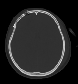 图5(妻子术前CT显示颅骨凹陷粉碎性骨折)