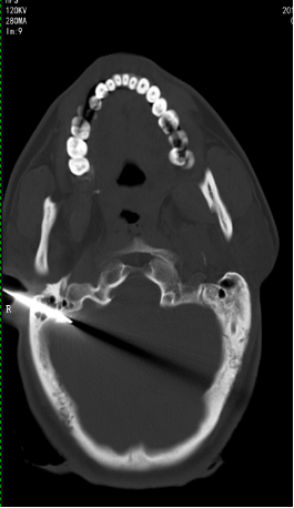 3月10日早晨8点左右,一对夫妻因头部多处刺伤被送120送入西安凤城医院急诊科接受治疗。丈夫被一把尖刀从右耳直接刺入,并且刀具断入颅内(图1、图2),妻子为开放性颅脑损伤、颅骨粉碎性凹陷骨折,当即昏迷,夫妻二人生命垂危。入院时丈夫不省人事,脉搏心跳十分微弱,急诊科医师立即对夫妻二人进行了相关检查,同时积极联系神经外科将病人转入神经外科继续抢救。神经外科王冰主任查看病人及检查结果之后,表示夫妇二人均为“重型颅脑损伤”,病情危重,随时有生命危险,必须立刻手术。家属听王冰主任讲述病情、手术方式、风险及可能出现的并发症后,积极要求手术。
