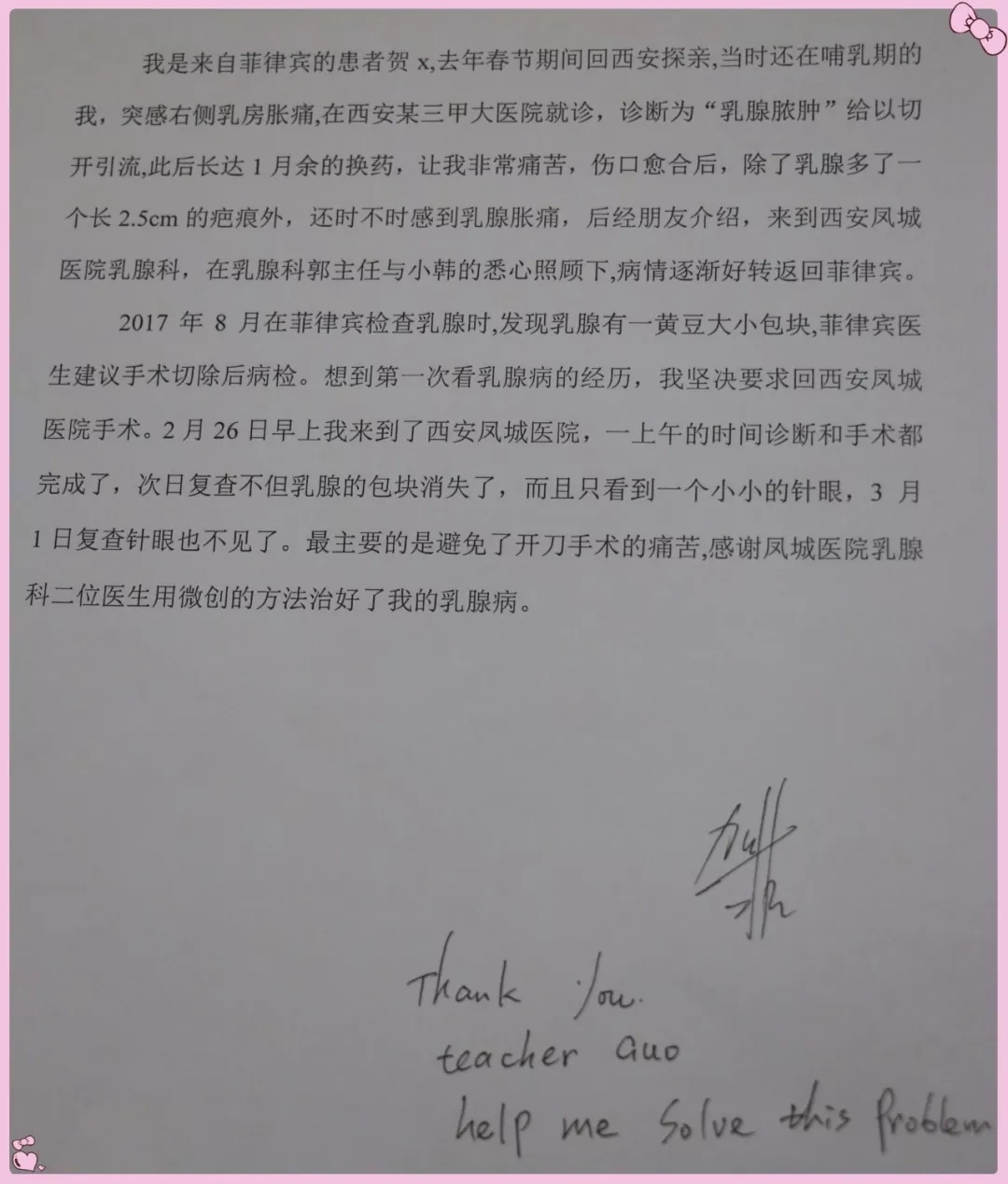 “感谢凤城医院乳腺病门诊用微创手术的方法,治好了我的乳腺病,使我免去了开刀手术的痛苦”说话的是一名来自菲律宾的患者贺x,去年春节期间回西安探亲,病人在哺乳期,突感右侧乳房胀痛,在西安某三甲大医院就诊,诊断为“乳腺脓肿”并给予切开引流,此后长达1月余的换药,使病人感到非常痛苦,伤口愈合后,除了乳腺多了一个长2.5cm的疤痕外,病人还时不时感到乳腺胀痛,后经朋友介绍,来到我院乳腺病门诊,检查结束后,我们做出一套针对患者的治疗方案,使病人的病情很快得到了好转,而且还可以继续给孩子喂奶了,痊愈后病人返回菲律宾。