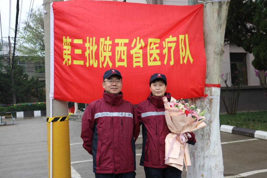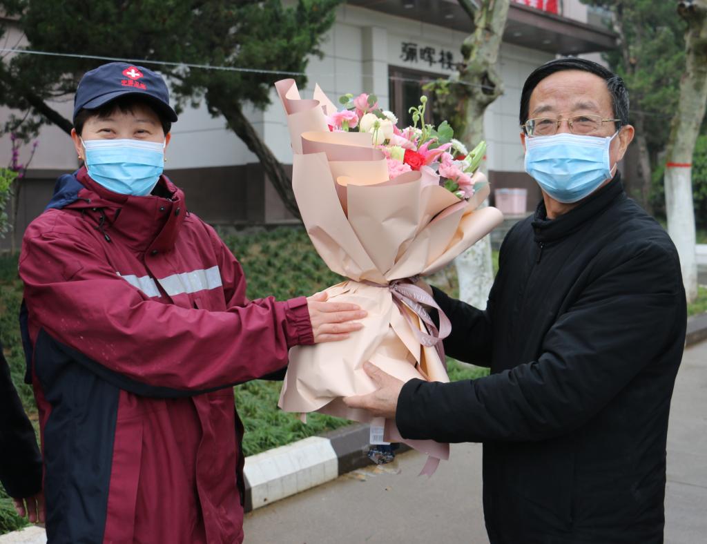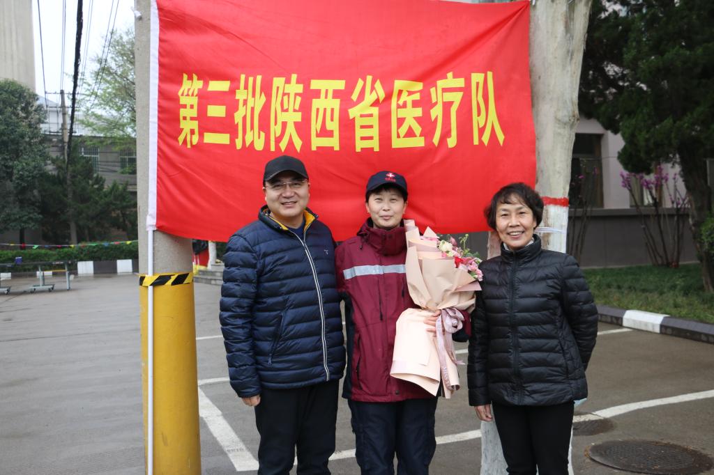 4月2日,我院随陕西省第三批医疗队援鄂英雄王红娟医生返陕隔离期满,医院常务副院长闫依群、党支部书记李建荣、业务副院长赵慧仙、医务科主任马力夫、呼吸与危重症医学科主任张志惠亲赴王红娟医生所在的隔离点——中国煤矿工人临潼疗养院,为其接风洗尘并送其回家。