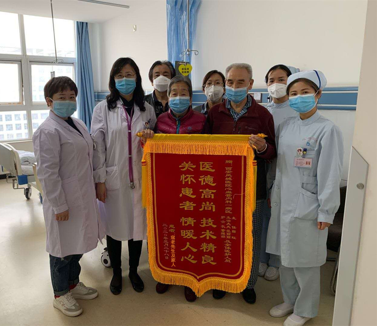 3月24日,历经80分钟顺利给寇老先生植入双腔永久起搏器。术后患者拉着薛虹主任的手激动地说:谢谢薛主任,是您救了我一命,我感觉自己像换了个心脏一样,没有任何不适了。为表示谢意,出院时家人送来一面写着“医德高尚 技术精良 关怀患者 情暖人心”的锦旗。