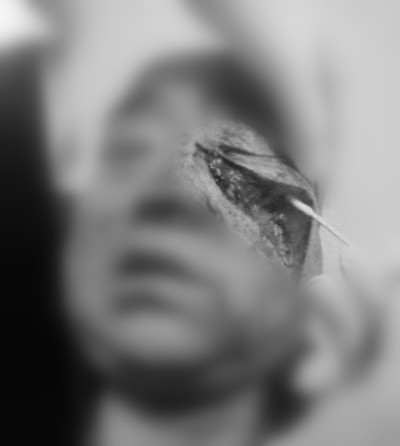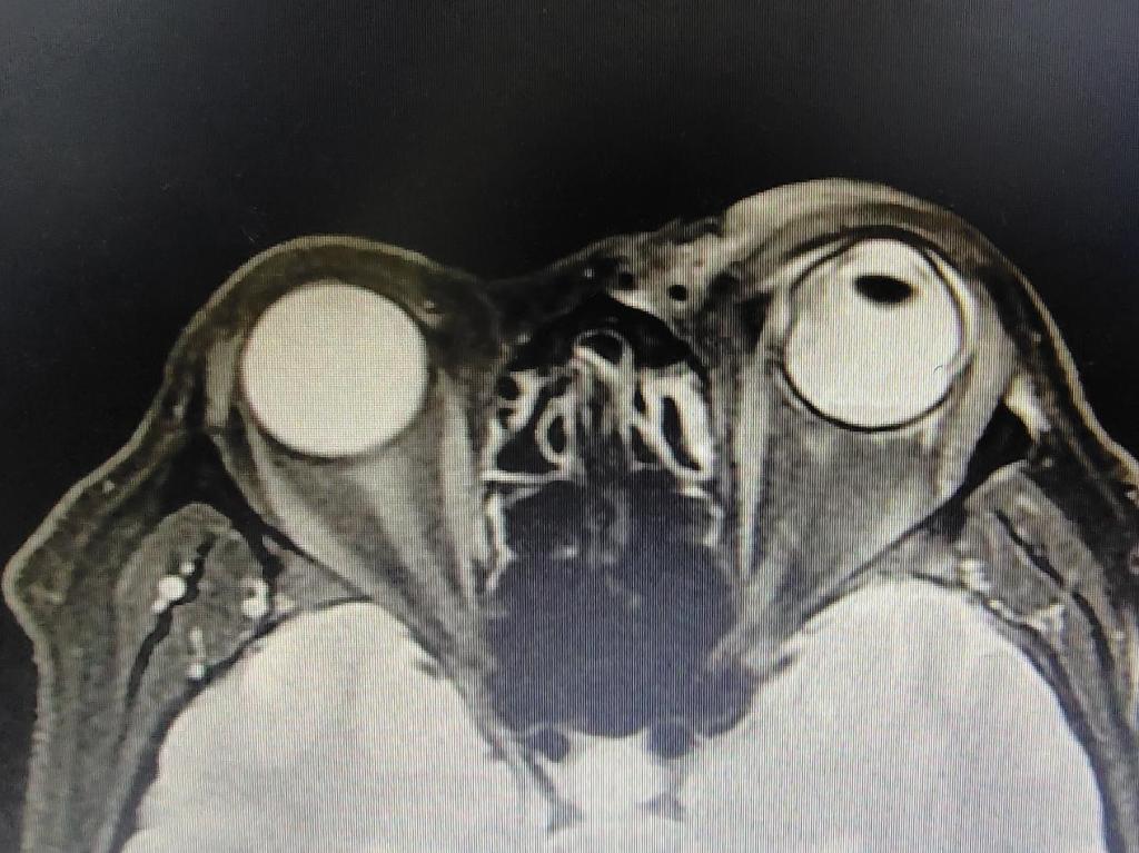 经询问病史得知,患者在使用角磨机工作时,被突然高速飞出的角磨片所伤。现感左侧颌面部出血疼痛,左眼视物模糊,眼痛。查左眼视力:光感,眼压: T-2,结膜囊可见血水流出,角膜雾浊,大量积血布满前房,眼内组织均窥不清。眼磁共振报危急值,疑似眼球破裂。果然情况比较复杂。(核磁成像如下)