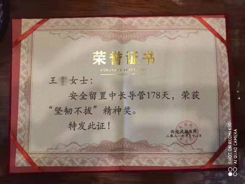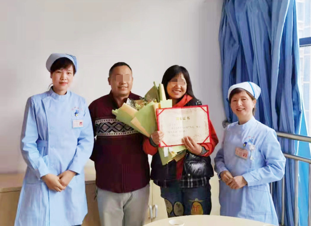 首先翟主任讲话:“来到普外科,看到大家和患者相处的非常融洽,像家人一样温暖,王女士与病魔顽强抗争的精神,值得我们每个人学习!普外科中长导管技术成熟而精湛,王女士从4月17日置管到昨日整个化疗疗程结束拔管,安全带管178天!创造了中长导管置管天数新纪录,这与患者的默契配合是分不开的,感谢并祝贺王女士康复出院!”随即颁发荣誉证书——王女士:安全留置中长导管178天,荣获“坚韧不拔”精神奖,送上鲜花。王女士和爱人非常感动,爱人邓先生说:“太激动了,半年多的点点滴滴,这个科室什么事情都为患者着想,我们现在不知道说什么好,还是念一下我们的感谢信吧!”
