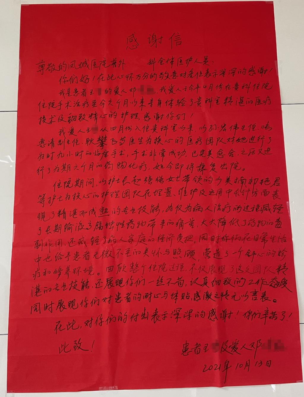 随后,王女士鼓励其他患者:“生病是不可怕的、可怕的是自己没有战胜病魔的信心,在我住院期间我非常感谢普外科的医护团队、是他们给了我战胜病魔的信心,也感谢我家属对我无微不至的照顾,才能使得我最后痊愈。”