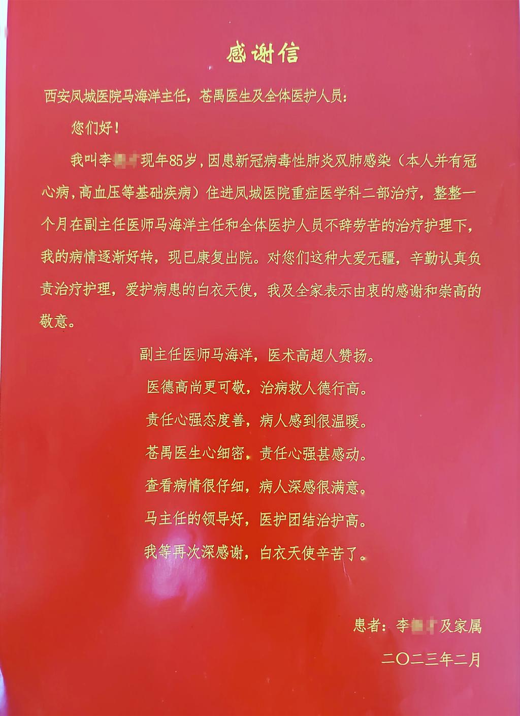 出院一周后,李老爷子的女儿为重症医学科二部送来了锦旗及亲手做的手工,还有一封感谢信,并告诉我们李老爷子近期身体康复如初。感谢重症医学科二部马海洋主任及重症团队全体医护人员。