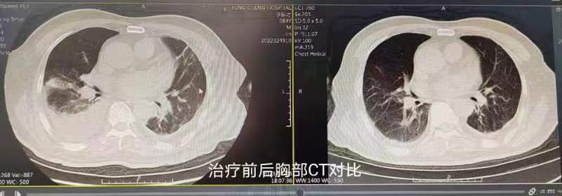 经过近1个月的精心治疗,在我科全体医护的共同努力下,老爷子的病情持续好转,止咳停喘了,各项化验指标均恢复正常,核酸检测阴性、肺部CT复查也比入院有明显吸收,不吸氧的情况下氧合指数(P/F):380mmHg。