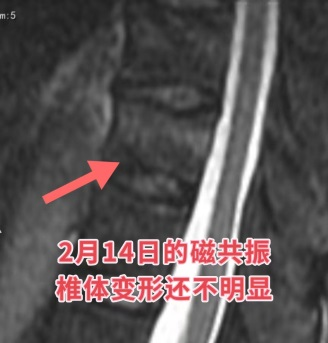 2月28日早上,老人家再次入院,复查磁共振提示骨折已经比上一次住院时明显加重,疼痛感也比以前更严重了,翻身及改变姿势时都会产生剧烈的疼痛。