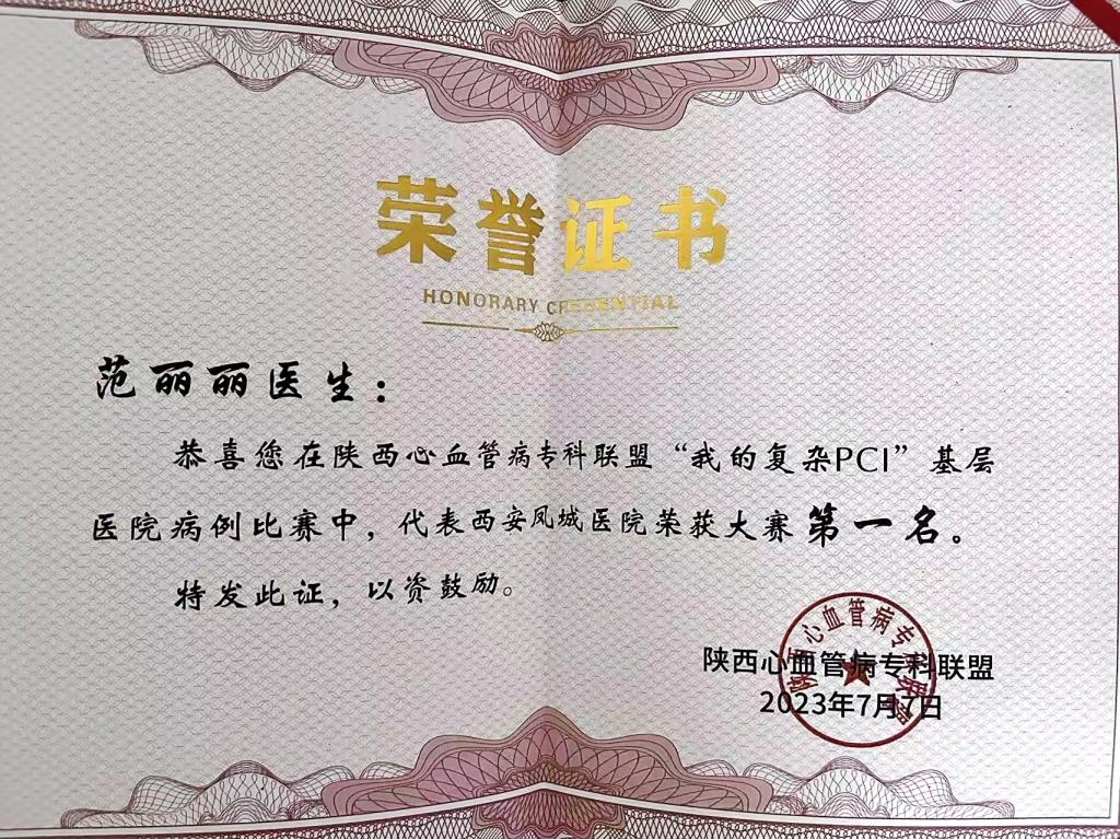 在陕西心血管病专科联盟论坛-基层医院病例比赛专场,西安凤城医院心血管内科一病区范丽丽医生的参赛病例《左主干合并三支病变介入治疗一例》,在大赛中脱颖而出,取得了第一名的好成绩。