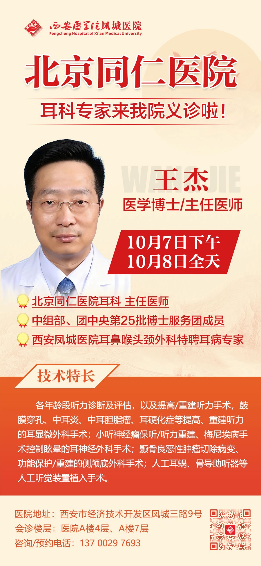 10月7日下午、10月8日全天,北京同仁医院耳科专家王杰博士/主任医师,将亲临西安凤城医院义诊!