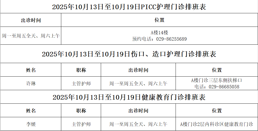 2025年10月13日至10月19日PICC护理、伤口造口护理、健康教育门诊排班表