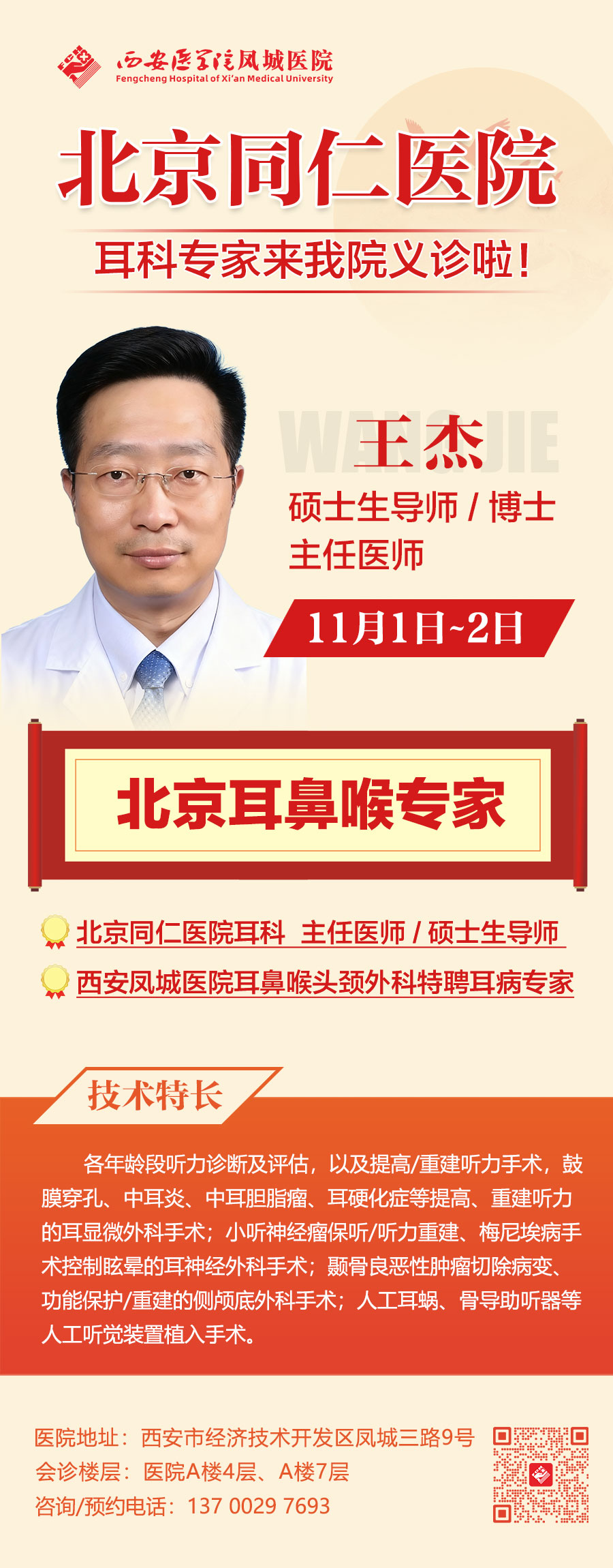11月1日-2日,全国耳鼻喉专家北京同仁医院王杰教授/博士/硕士生导师/主任医师,亲临西安凤城医院坐诊、手术!