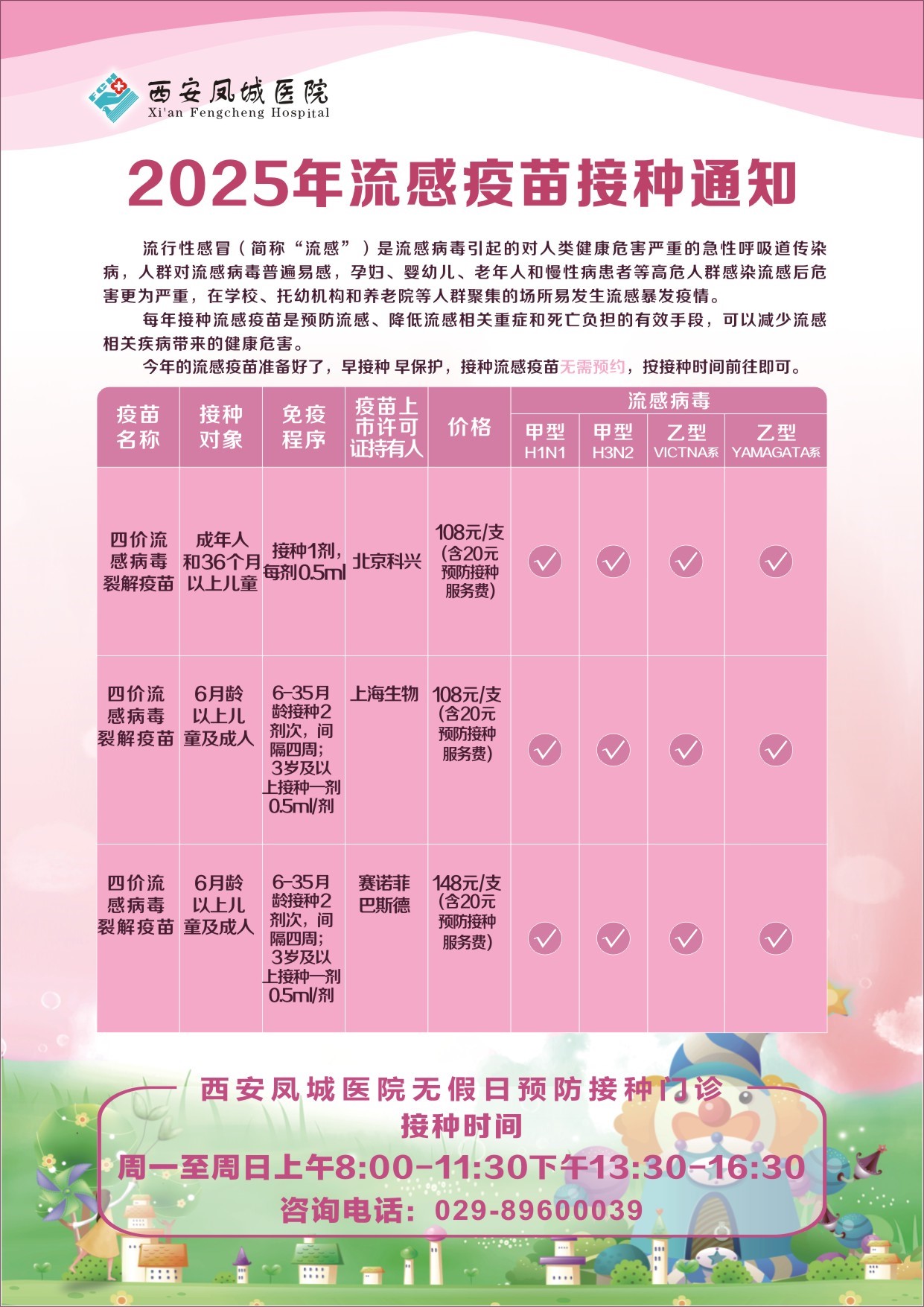 为有效预防流感病毒对人群的危害,提高流感疫苗接种率,方便周边群众能够及时、便捷接种流感疫苗,我院预防接种科自2025年11月10日-11月14日开展无假日流感疫苗接种延时门诊。现将接种时间公示如下:
