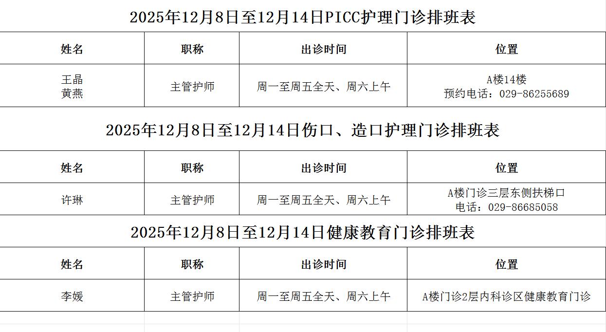 2025年12月8日至12月14日PICC护理、伤口造口护理、健康教育门诊排班表