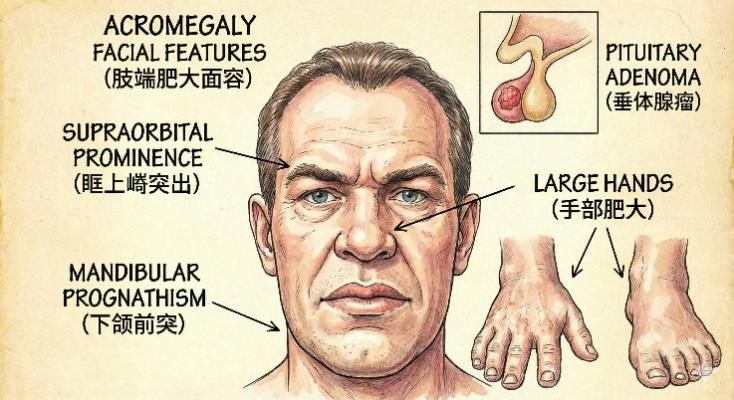 生长激素瘤:过度分泌生长激素,成人期可能出现肢端肥大症(手脚增大,面容变大),而儿童期则可能导致巨人症。