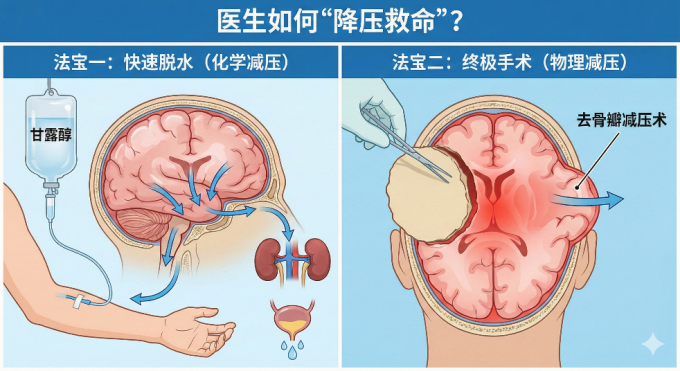 1、快速脱水——“化学减压”:医生会立刻使用脱水药物,最经典的就是甘露醇。通过快速静脉输注,提高血液的渗透压,把脑组织里多余的水分“吸”回血管里排出去,快速为大脑“减负”。