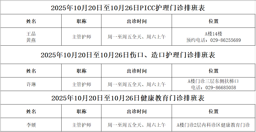 2025年10月20日至10月26日PICC护理、伤口造口护理、健康教育门诊排班表