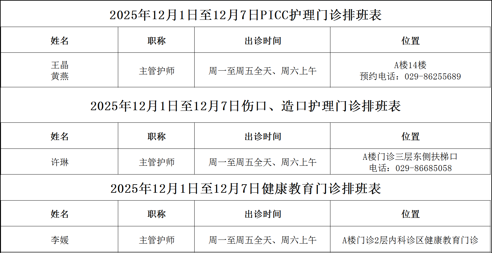 2025年12月1日至12月7日PICC护理、伤口造口护理、健康教育门诊排班表