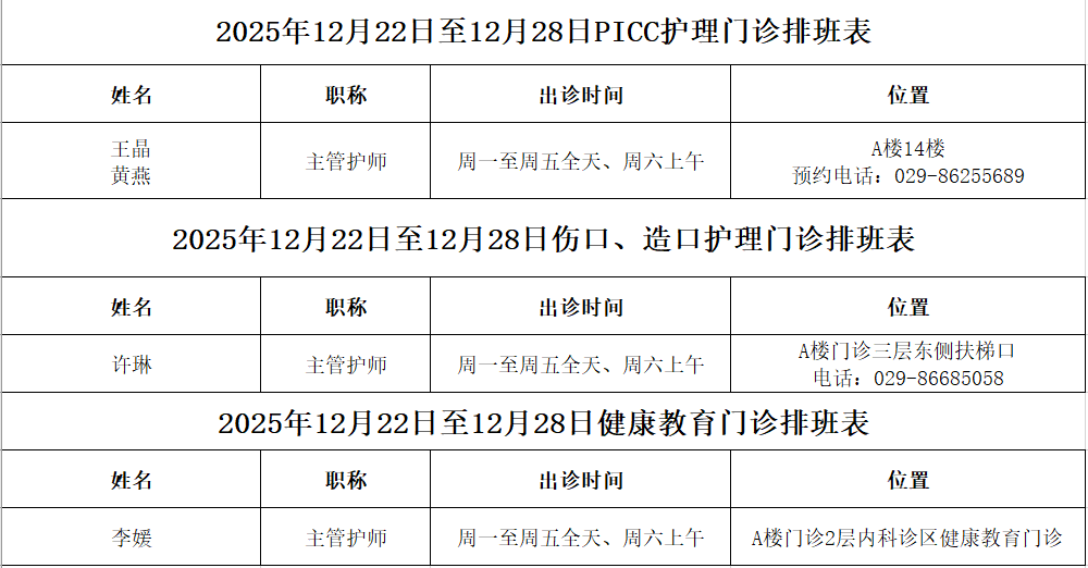 下一篇:2025年12月15日至12月21日PICC护理、伤口造口护理、健康教育门诊排班表
